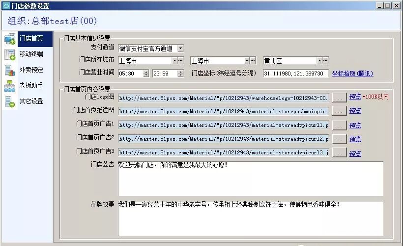 a、后台--门店参数,可设置门店所在城市、地区、定位坐标、营业时间;